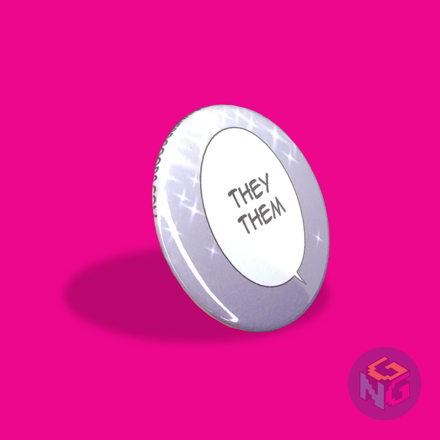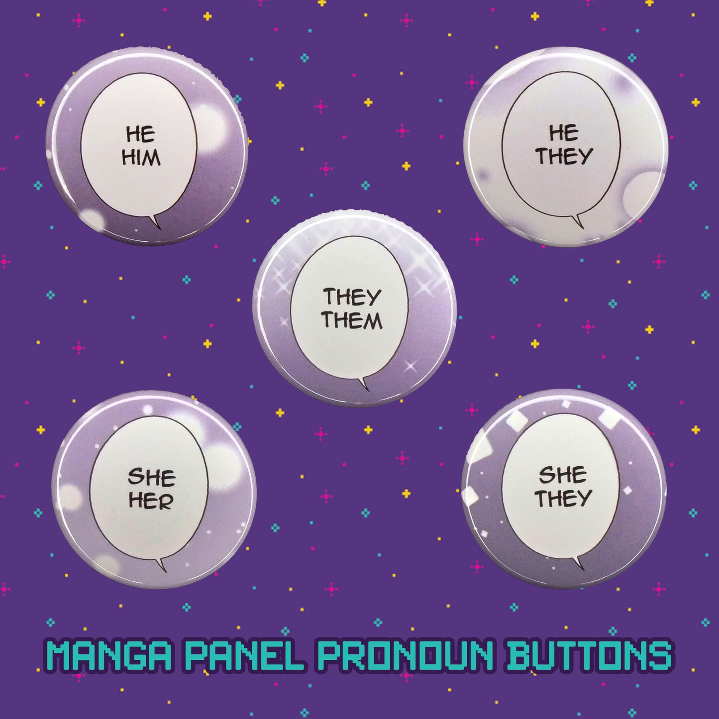 Add some flair to your backpack or jacket with our manga pronoun buttons! With she/her, she/they, they/them, he/they, and he/him options, you can show off your preferred pronouns in a fun and playful way. Featuring a manga panel design, these black and white round pinback buttons are a great conversation starter.