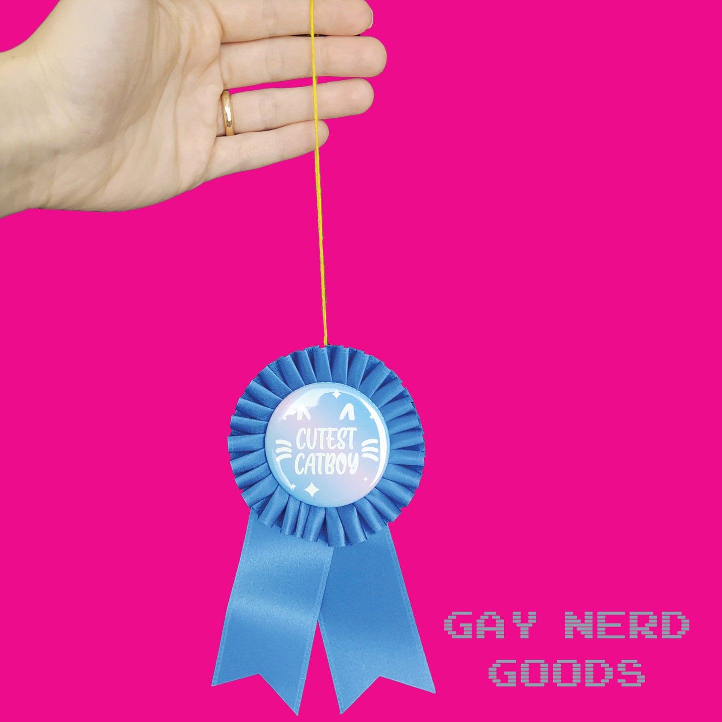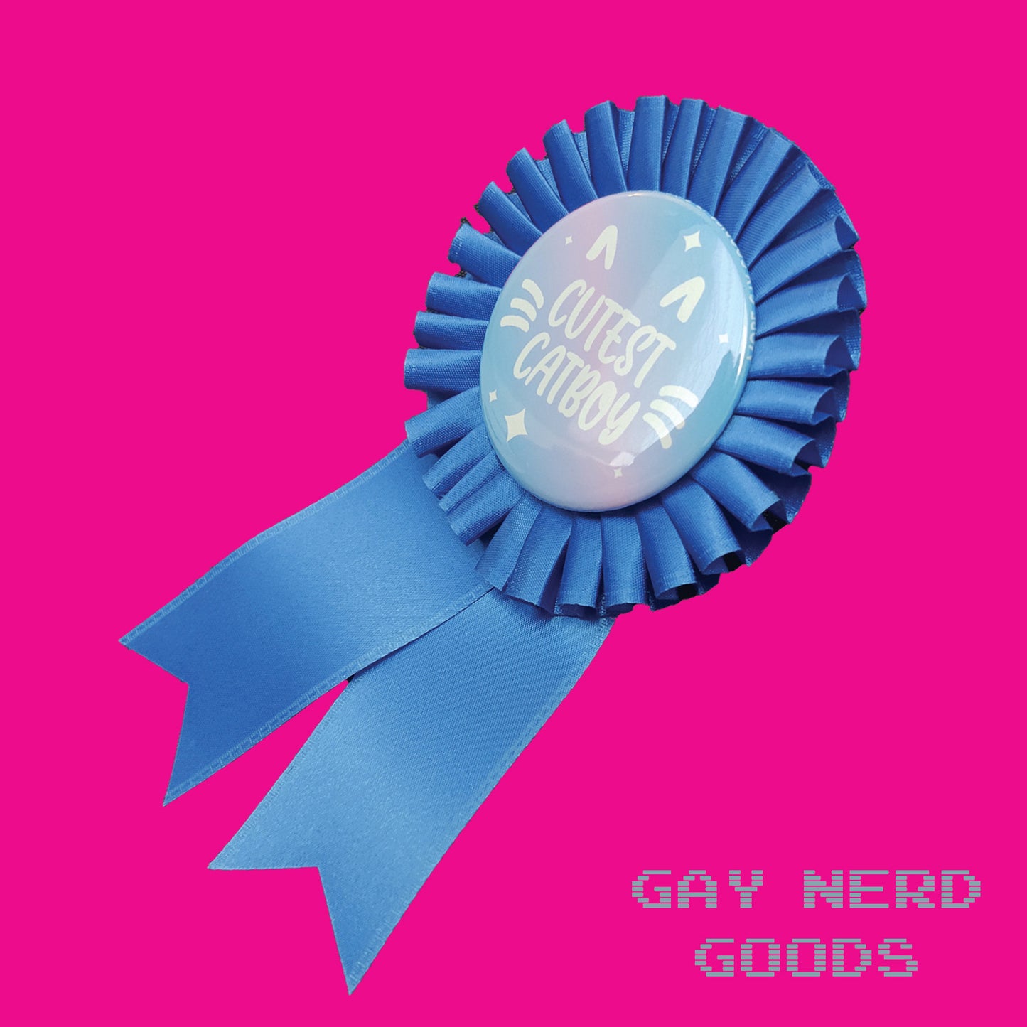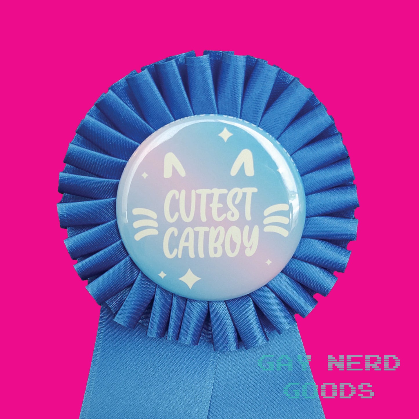 Show your little meow meow who's really the "Cutest Catboy" with our award ribbon! Crafted from dark blue satin, it features a blue 2.25" round button with a pinback and thread loop. You'll have them purring with satisfaction you pin this shining award to their collar. Works great for both ita bags and cosplays!