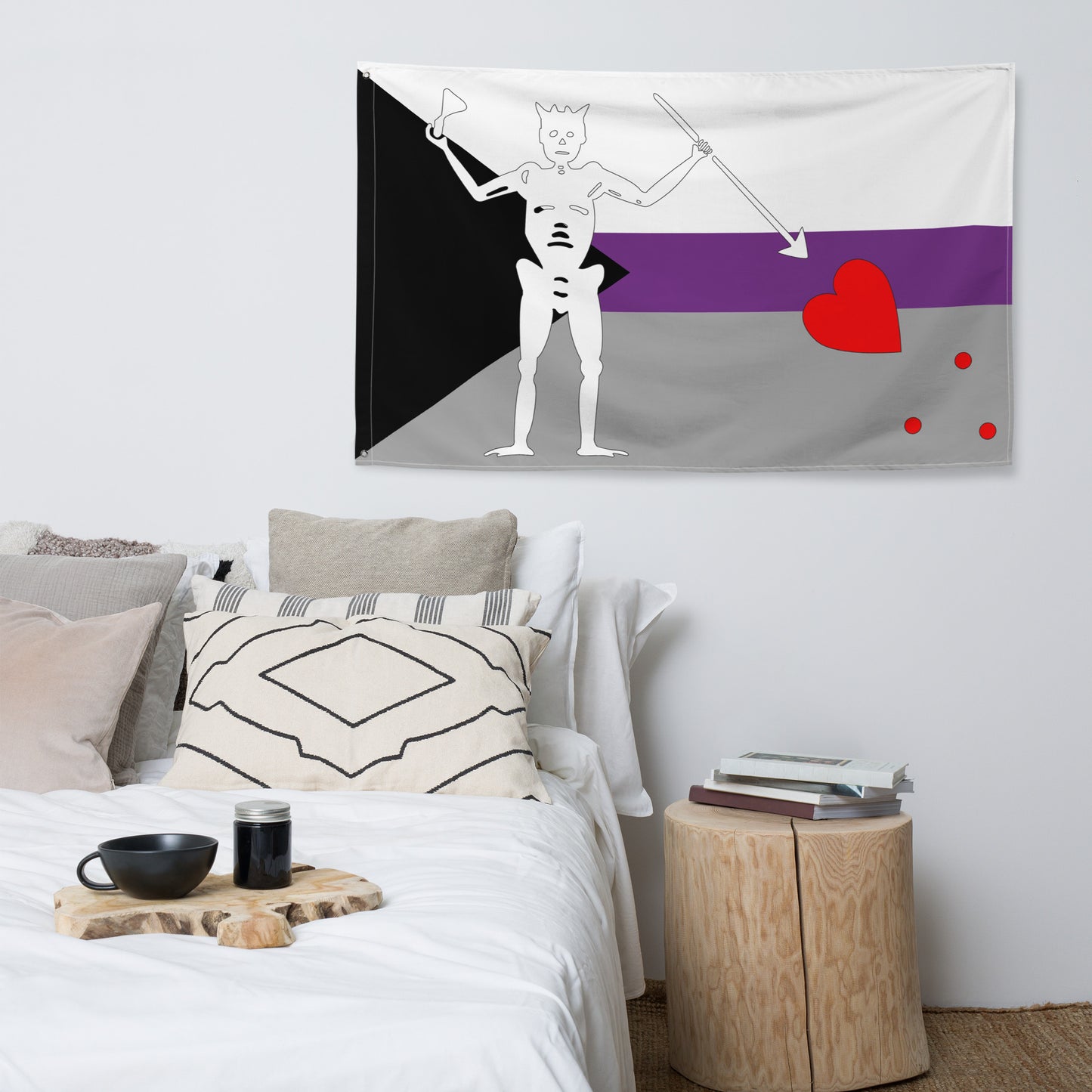 Our flag means gay! For all the queer pirate lovers who got their gay awakening from Keira Knightley and/or Orlando Bloom in Pirates of the Caribbean. Or for those who fell in love with the scallywags in Our Flag Means Death. The design features Blackbeard's logo of a skeleton holding a cup and spear pointed at a bleeding heart. The background is the stripes of the demisexual flag in grey, white, and purple, with a black triangle.