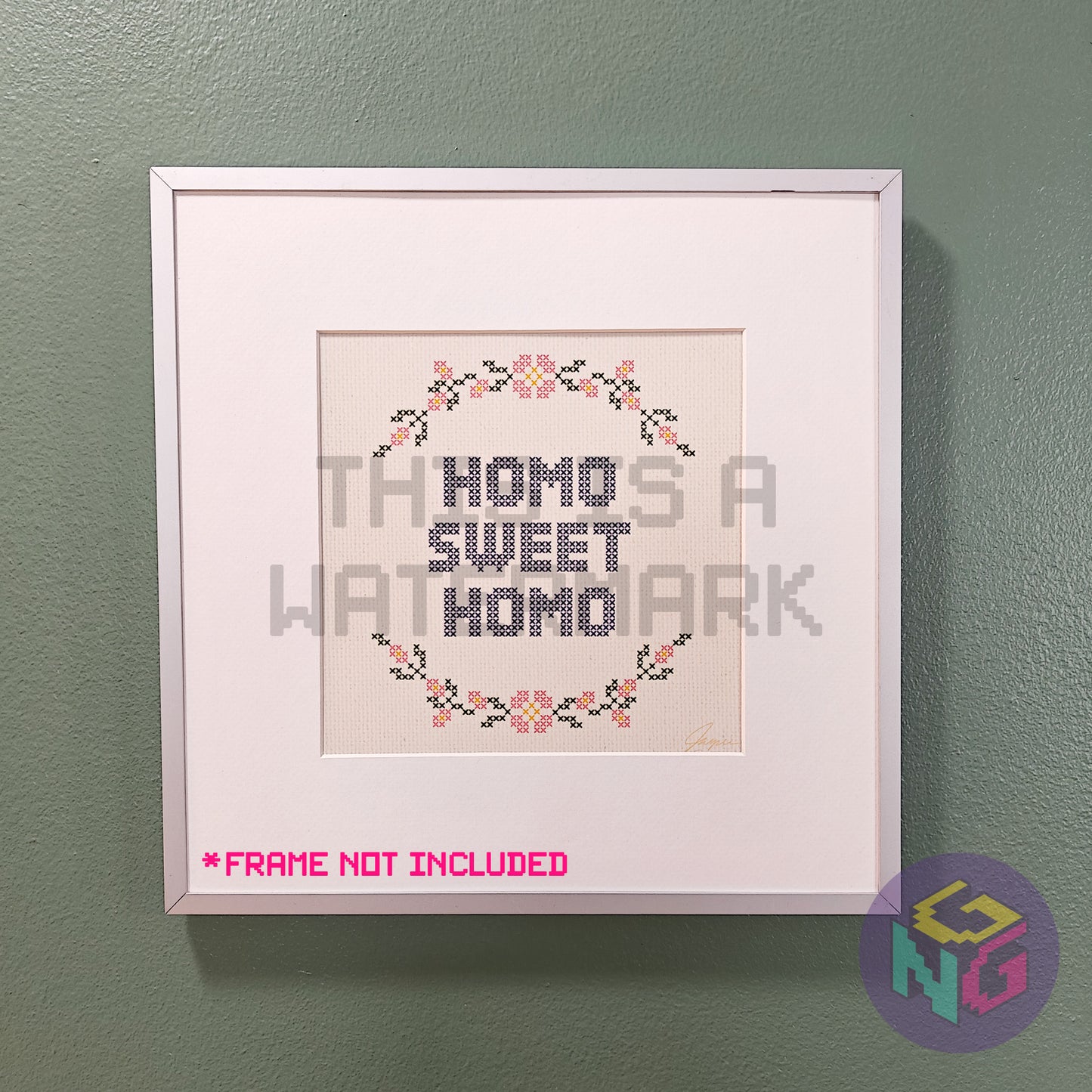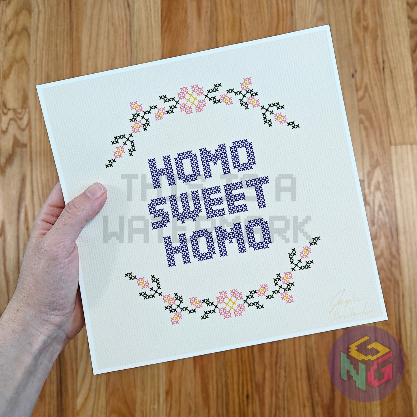 Brighten up any wall with this adorable 8.5"x8.5" art print! It's printed on thick matte cardstock with a faux cross-stitch pattern of pink flowers and the phrase, "homo sweet homo". A perfect way to make your house feel like a homo- er, home.