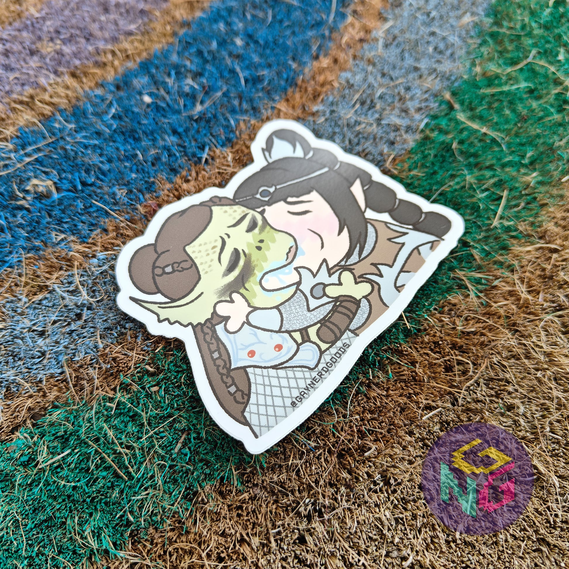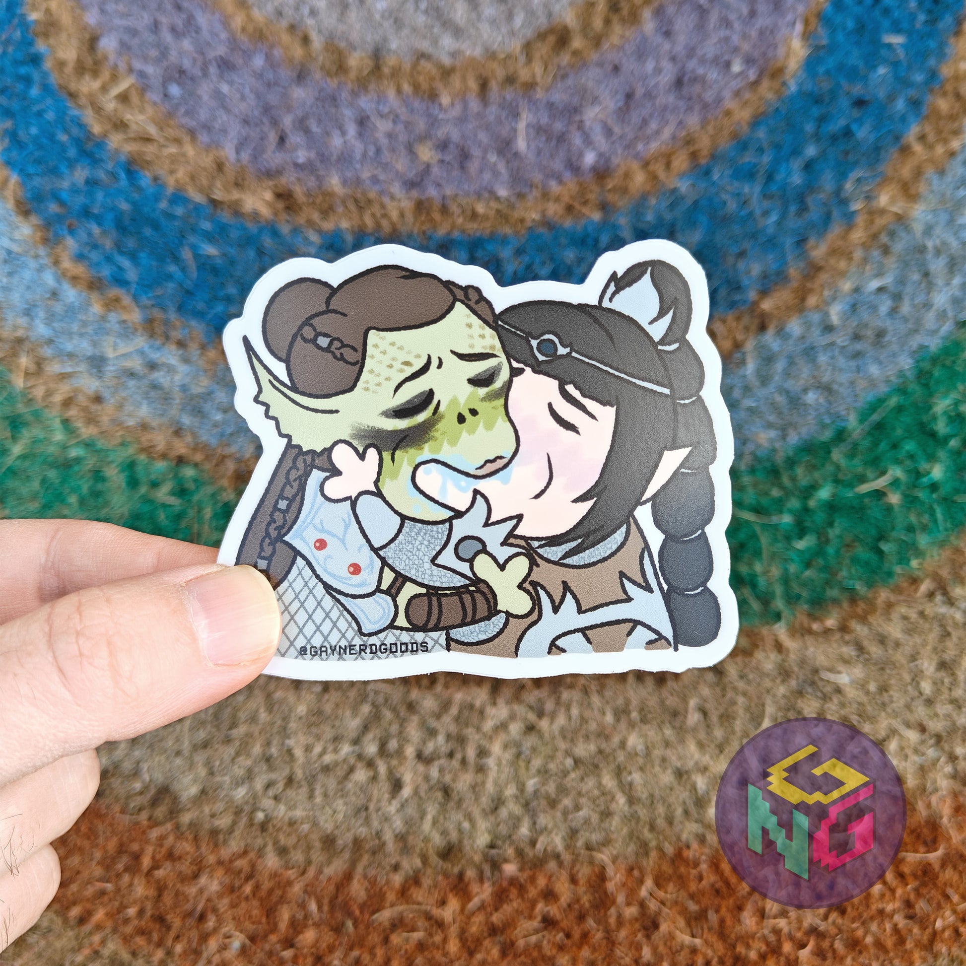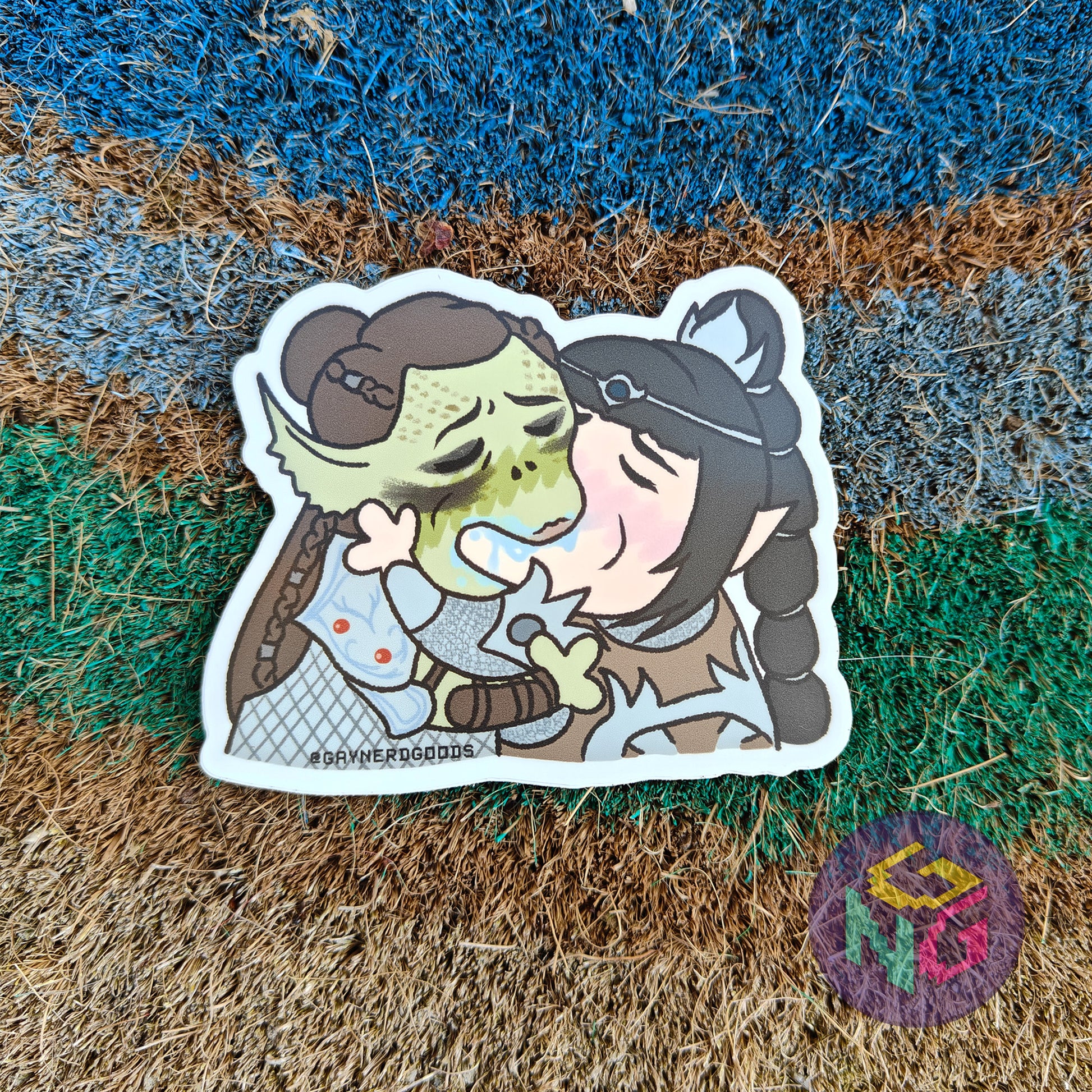 Did anyone else think their fight was going to end differently? They may start at each others' throats but they'll end up in love. This sticker design features a cartoony Lae'zel and Shadowheart making out sloppy style.