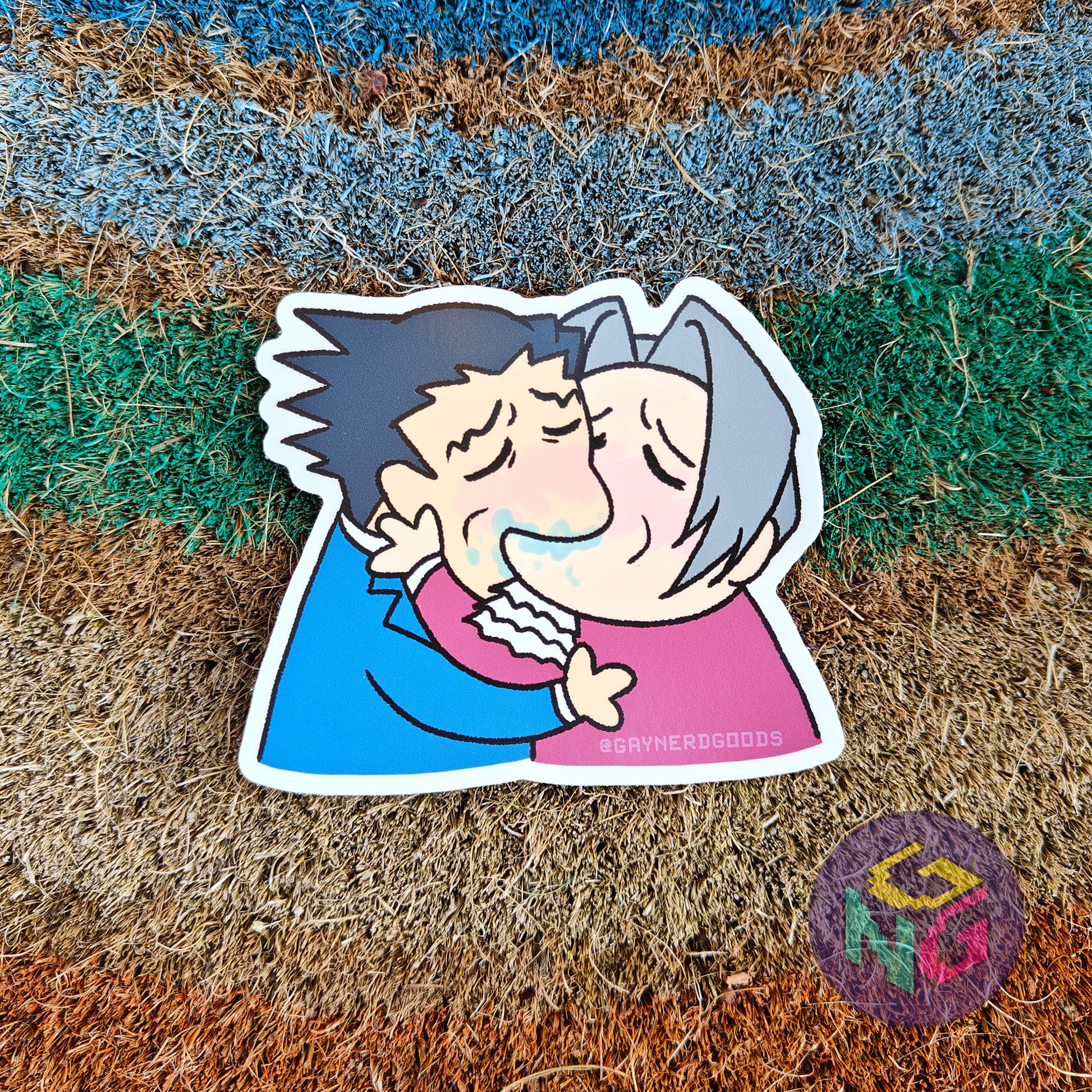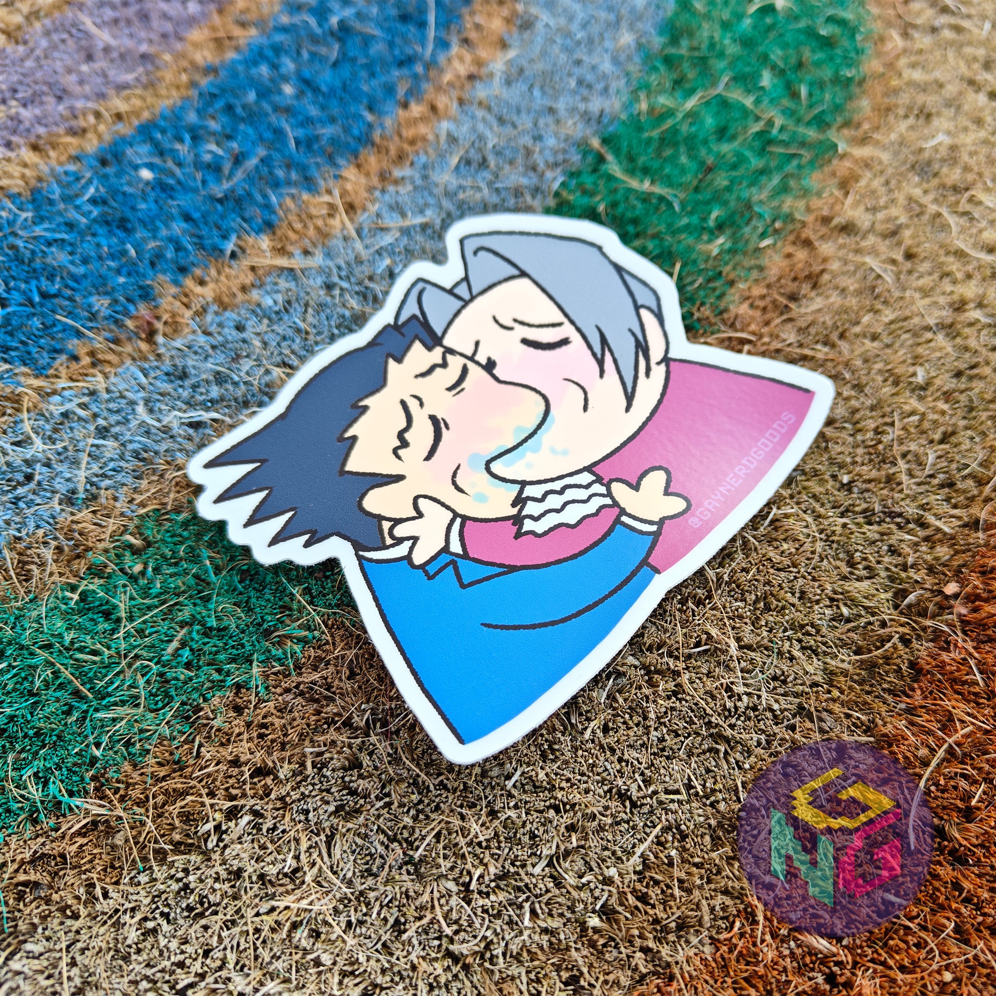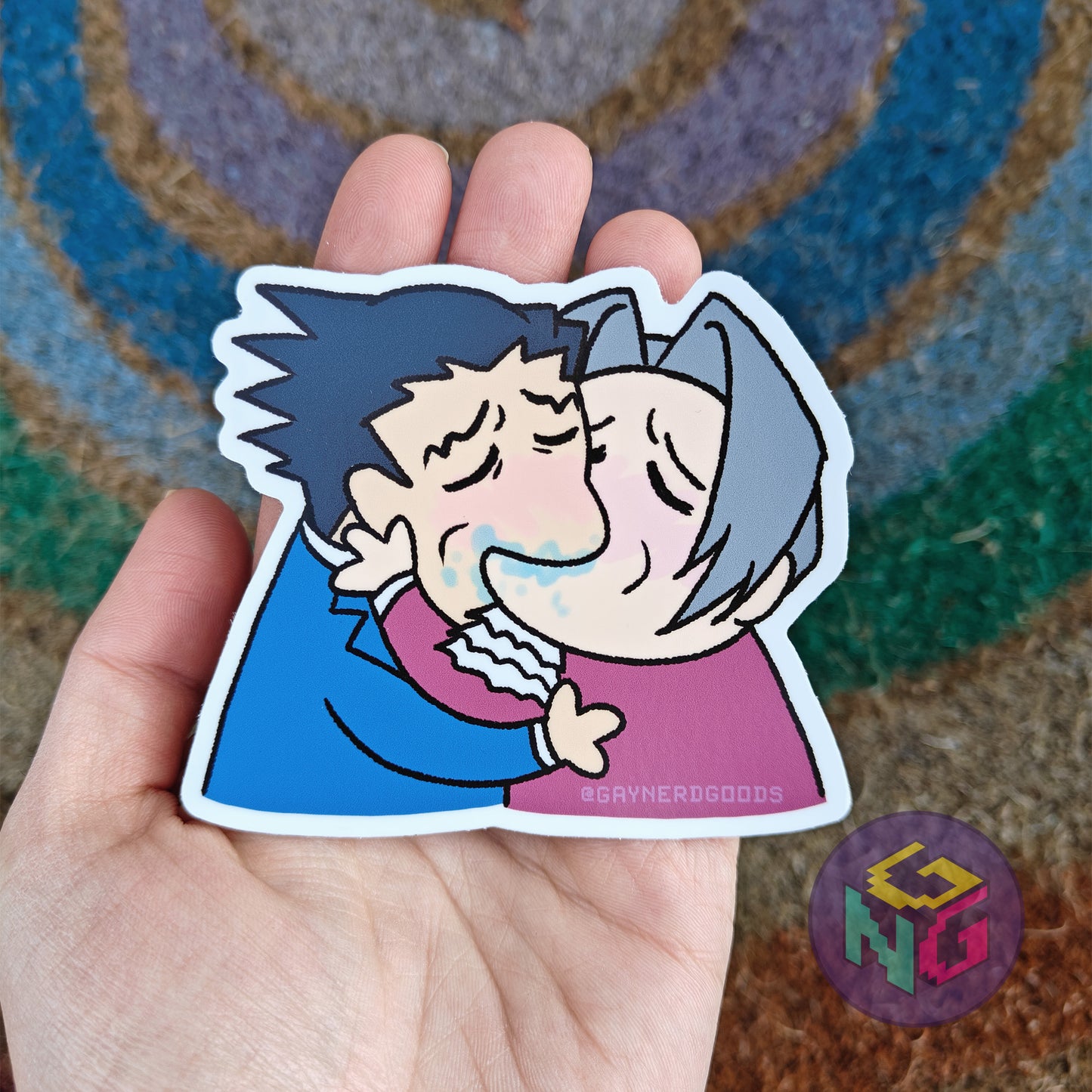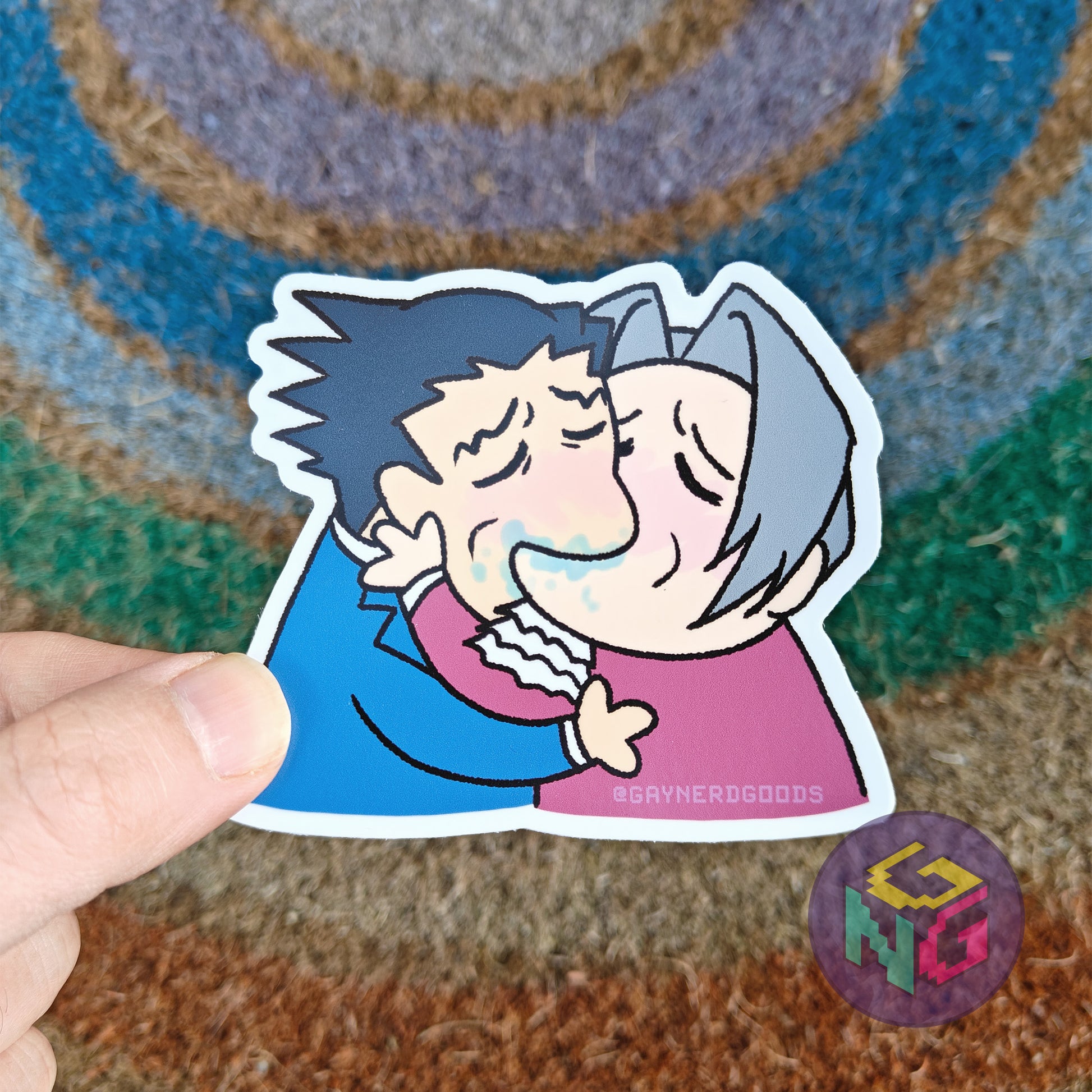 No one's objecting to this union! But you may have to catch the judge and Gumshoe up to speed. This sticker design features a cartoony Phoenix and Edgeworth making out sloppy style.