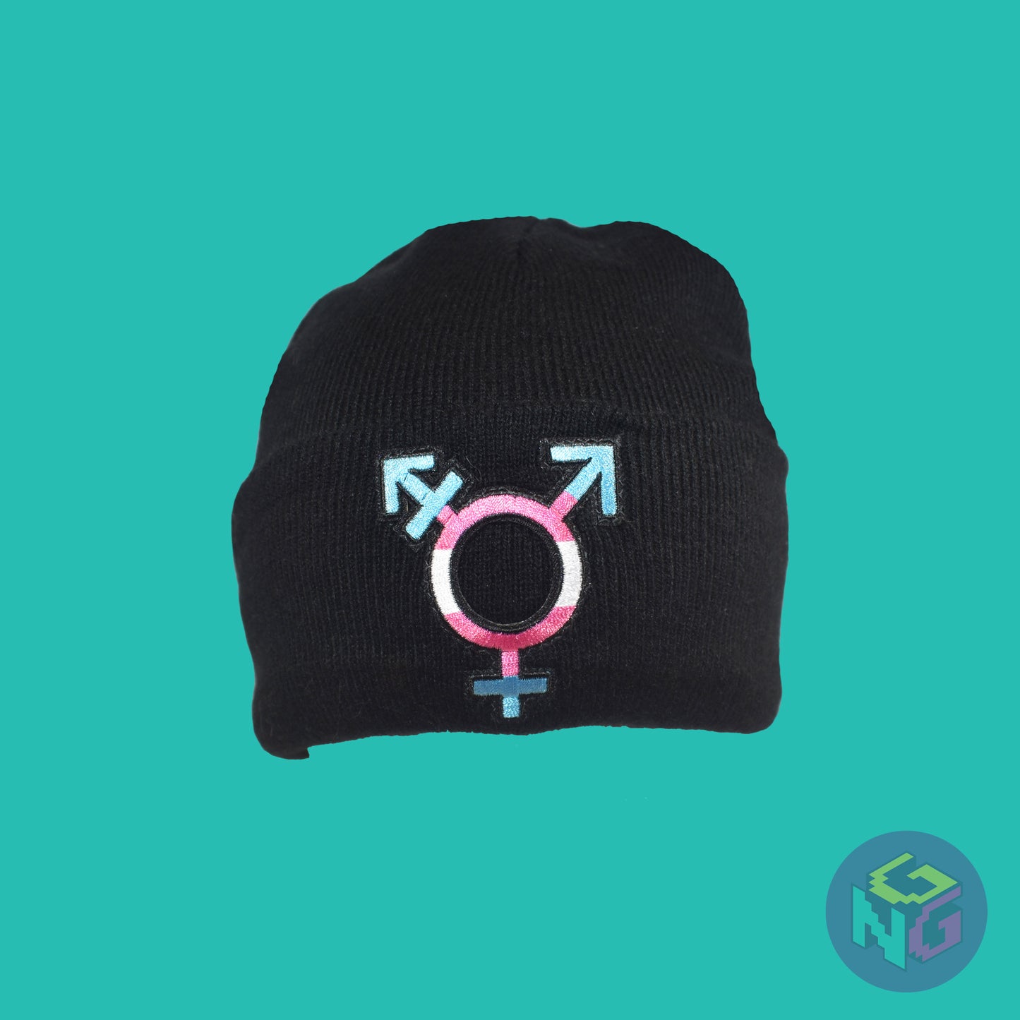 The patches are three inches tall and embroidered. The patches feature the transgender symbol in the colors of the transgender pride flag: blue, pink, and white. The patches are securely machine sewn to the front. The hats are large, black, and stretchy; one size fits most.